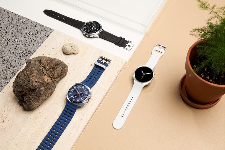▲ (De izquierda a derecha) Galaxy Watch8, Galaxy Watch8 Classic y Galaxy Watch Ultra en Titanium Blue