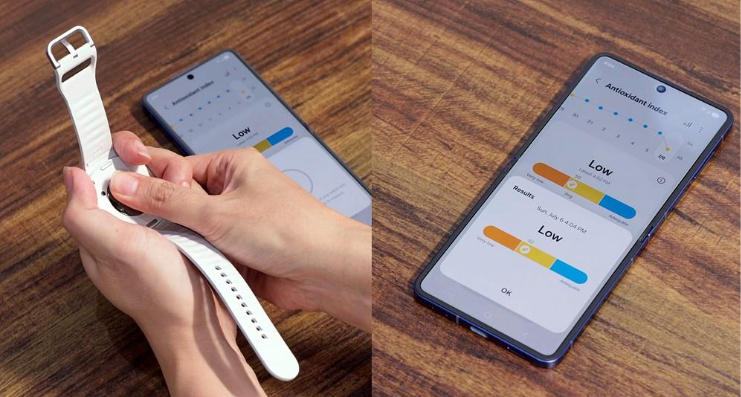 Al colocar el pulgar sobre el sensor BioActive en la parte posterior del reloj durante cinco segundos, los usuarios reciben un puntaje numérico y un resultado codificado por colores que representa su nivel de antioxidantes. Esta función permite monitorear fácilmente la salud relacionada con el envejecimiento, ofreciendo información intuitiva sobre los hábitos alimenticios y de estilo de vida.